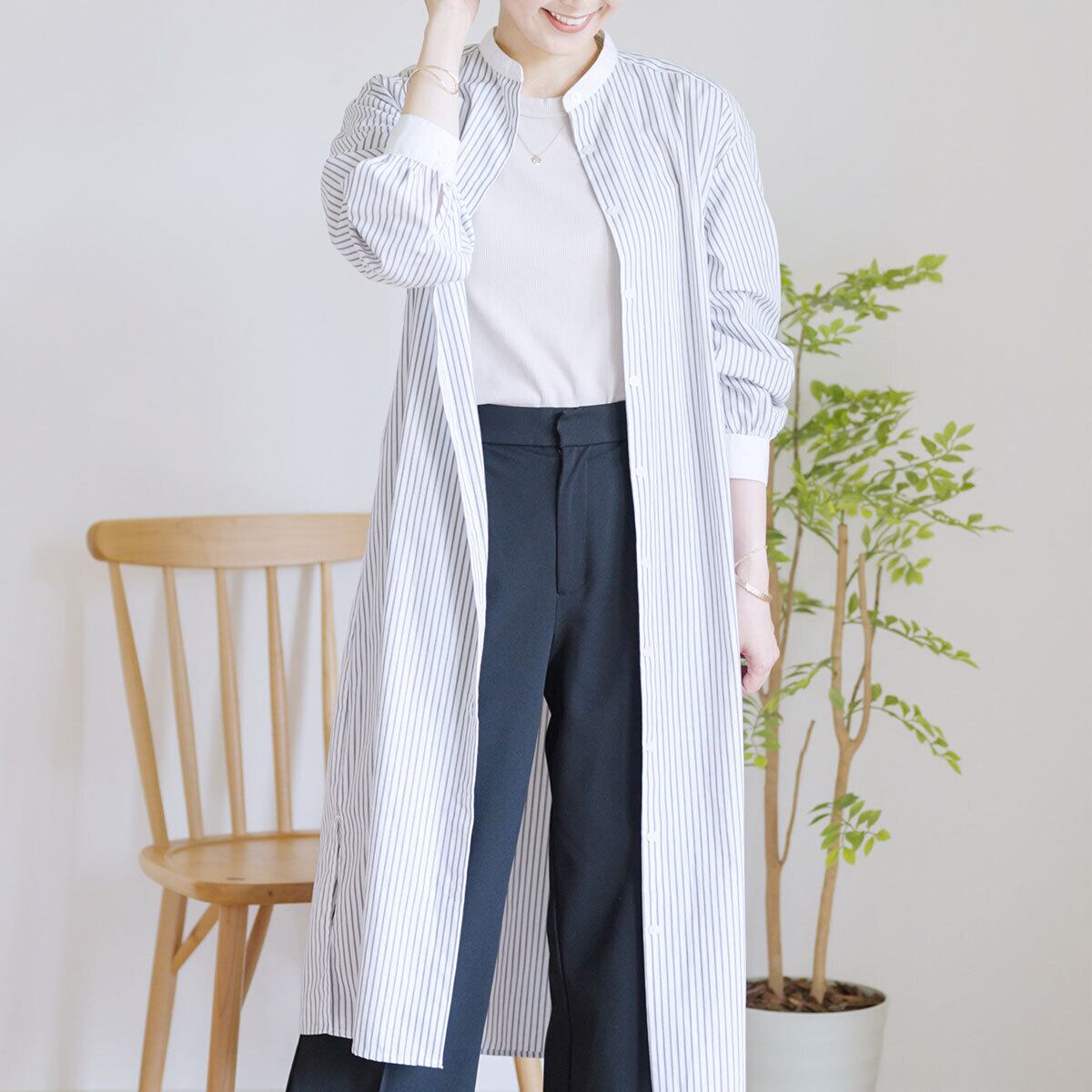 爽やかなストライプ柄が目を惹くロング丈のスタンドカラーシャツ。 一枚でさらっと羽織れる軽やかな素材感で、春夏のレイヤードスタイルにぴったり。 サイドスリット入りで動きやすく、パンツとの相性も抜群。 カジュアルにもきれいめにも着回せる、万能アイテムです。 サイズ:Free 表地:ポリステル65% レーヨン35% ※このサイトはBASEテンプレート「Stylebook(スタイルブック)」のデモサイトです。実際にはご購入できませんのでご注意ください。